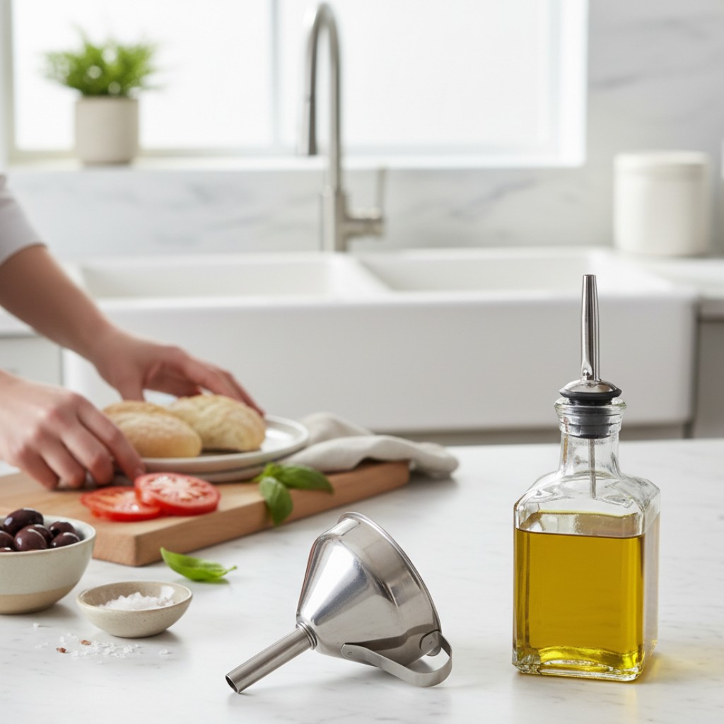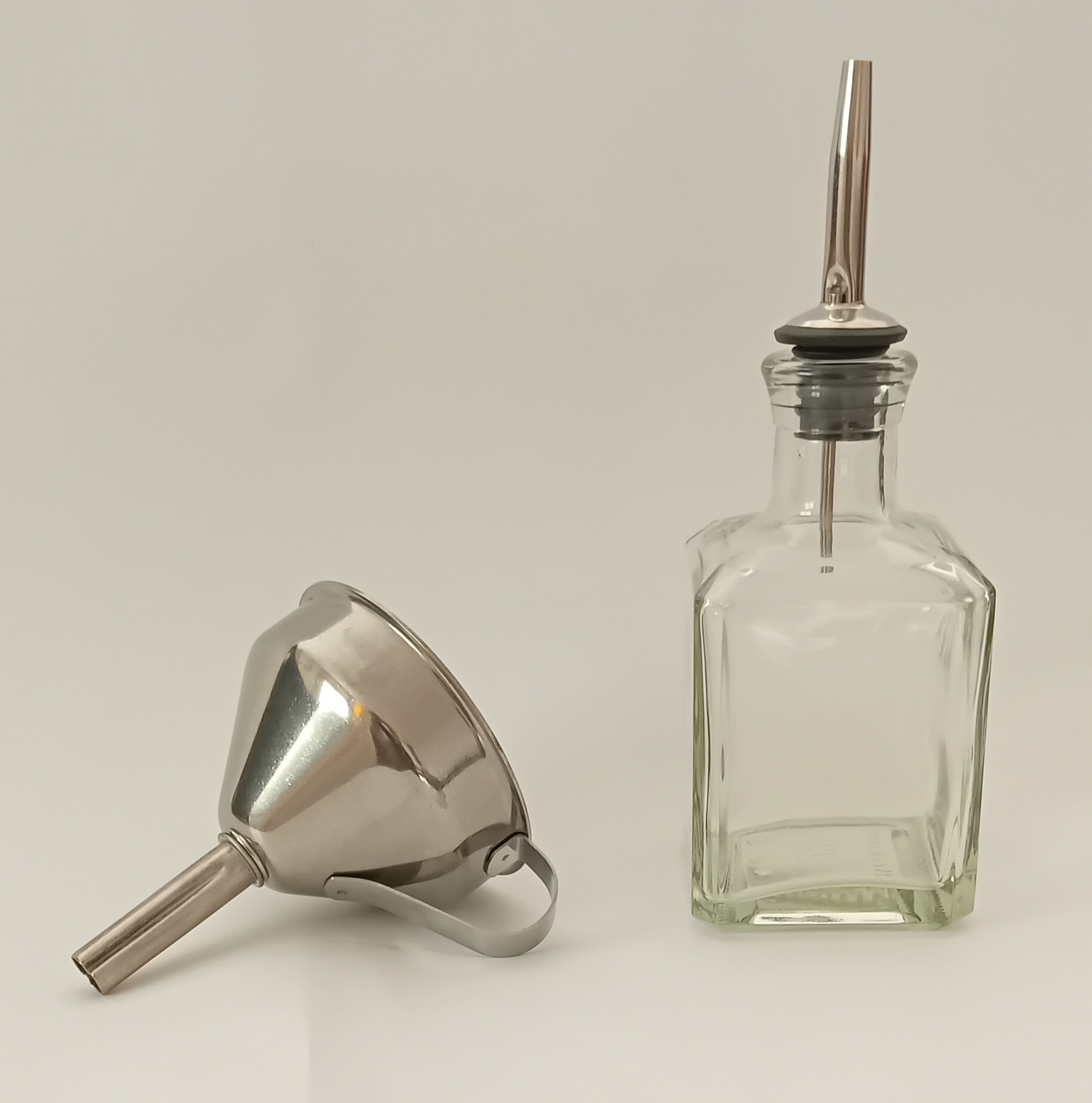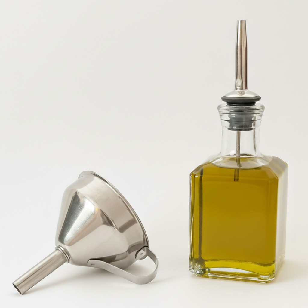 Un pratico kit composto da imbutino in acciaio inox, versatore per olio in acciaio inox ed oliera da 250 ml.
