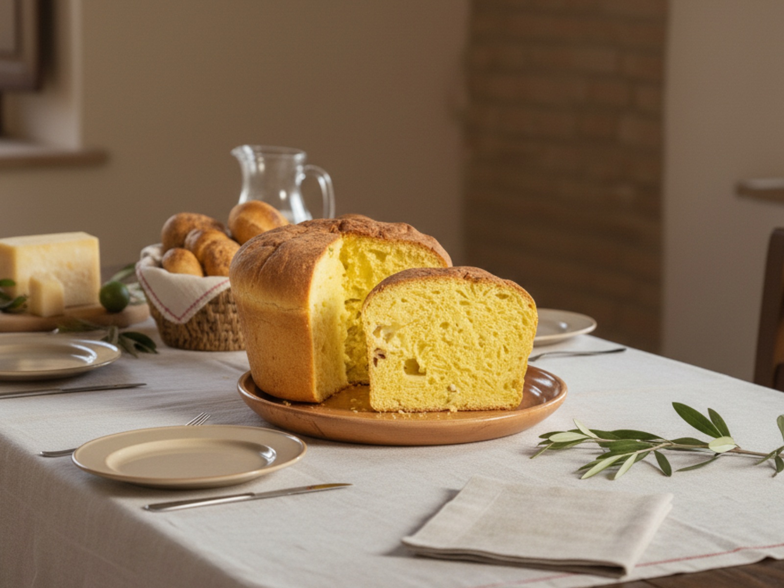 Prodotto tipico, tra le migliori specialitร della Pasqua Umbra: Impasto di farina, uova, parmigiano grattugiato, pecorino a dadini e olio evo, a lunga lievitazione e cotto rigorosamente in forno a legna